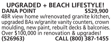 UPGRADED + BEACH LIFESTYLE! DANA POINT $529,900 4BR view home w/renovated granite kitchen, upgraded BAs w/granite vanity counters, crown moulding, new paint, rebuilt decks & balconies. Over $100,000 in renovation & upgrades! (526963) CALL (800) 387-1455
