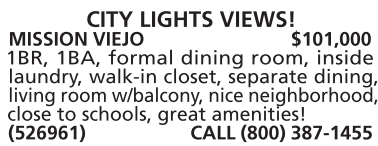 MISSION VIEJO $101,000 1BR, 1BA, formal dining room, inside laundry, walk-in closet, separate dining, living room w/balcony, nice neighborhood, close to schools, great amenities! (526961) CALL (800) 387-1455