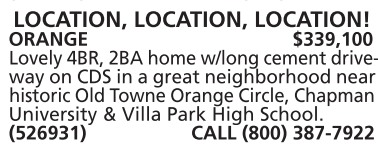 ORANGE $339,100 Lovely 4BR, 2BA home w/long cement driveway on CDS in a great neighborhood near historic Old Towne Orange Circle, Chapman University & Villa Park High School. (526931) CALL (800) 387-7922