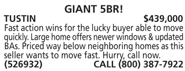 TUSTIN $439,000 Fast action wins for the lucky buyer able to move quickly. Large home offers newer windows & updated BAs. Priced way below neighboring homes as this seller wants to move fast. Hurry, call now. (526932) CALL (800) 387-7922