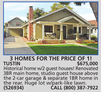 TUSTIN $675,000 Historical home w/2 guest houses! Renovated 3BR main home, studio guest house above the 2-car garage & separate 1BR home in the rear. Huge lot w/park-like lawn. (526934) CALL (800) 387-7922