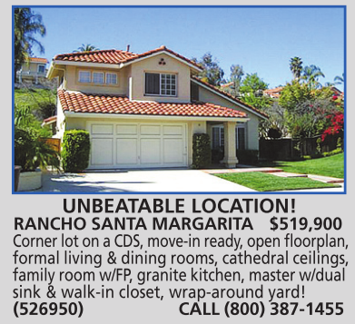 RANCHO SANTA MARGARITA $519,900 Corner lot on a CDS, move-in ready, open floorplan, formal living & dining rooms, cathedral ceilings, family room w/FP, granite kitchen, master w/dual sink & walk-in closet, wrap-around yard! (526950) CALL (800) 387-1455