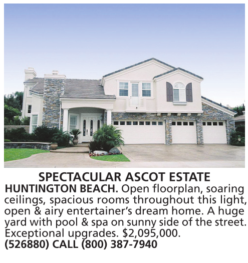 SPECTACULAR ASCOT ESTATE HUNTINGTON BEACH. Open floorplan, soaring ceilings, spacious rooms throughout this light, open & airy entertainer’s dream home. A huge yard with pool & spa on sunny side of the street. Exceptional upgrades. $2,095,000. (526880) CALL (800) 387-7940