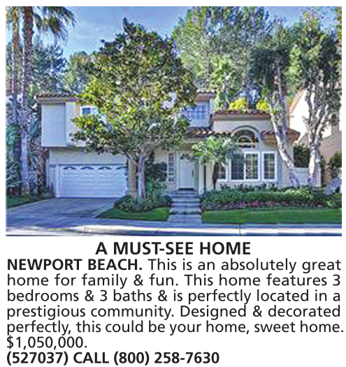 A MUST-SEE HOME NEWPORT BEACH. This is an absolutely great home for family & fun. This home features 3 bedrooms & 3 baths & is perfectly located in a prestigious community. Designed & decorated perfectly, this could be your home, sweet home. $1,050,000. (527037) CALL (800) 258-7630