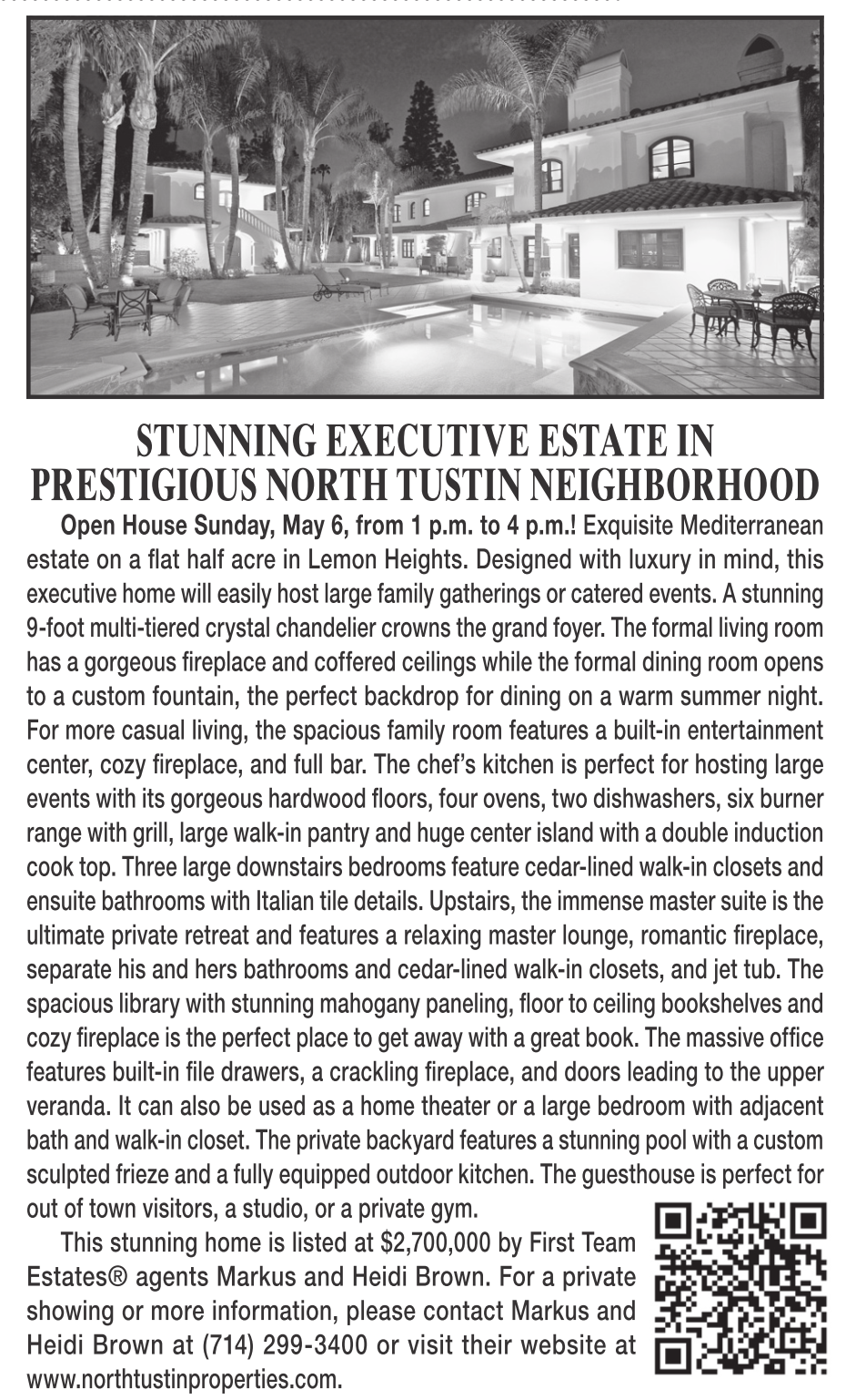STUNNING EXECUTIVE ESTATE IN PRESTIGIOUS NORTH TUSTIN NEIGHBORHOOD Open House Sunday, May 6, from 1 p.m. to 4 p.m.! Exquisite Mediterranean estate on a flat half acre in Lemon Heights. Designed with luxury in mind, this executive home will easily host large family gatherings or catered events. A stunning 9-foot multi-tiered crystal chandelier crowns the grand foyer. The formal living room has a gorgeous fireplace and coffered ceilings while the formal dining room opens to a custom fountain, the perfect backdrop for dining on a warm summer night. For more casual living, the spacious family room features a built-in entertainment center, cozy fireplace, and full bar. The chef’s kitchen is perfect for hosting large events with its gorgeous hardwood floors, four ovens, two dishwashers, six burner range with grill, large walk-in pantry and huge center island with a double induction cook top. Three large downstairs bedrooms feature cedar-lined walk-in closets and ensuite bathrooms with Italian tile details. Upstairs, the immense master suite is the ultimate private retreat and features a relaxing master lounge, romantic fireplace, separate his and hers bathrooms and cedar-lined walk-in closets, and jet tub. The spacious library with stunning mahogany paneling, floor to ceiling bookshelves and cozy fireplace is the perfect place to get away with a great book. The massive office features built-in file drawers, a crackling fireplace, and doors leading to the upper veranda. It can also be used as a home theater or a large bedroom with adjacent bath and walk-in closet. The private backyard features a stunning pool with a custom sculpted frieze and a fully equipped outdoor kitchen. The guesthouse is perfect for out of town visitors, a studio, or a private gym. This stunning home is listed at $2,700,000 by First Team Estates® agents Markus and Heidi Brown. For a private showing or more information, please contact Markus and Heidi Brown at (714) 299-3400 or visit their website at www.northtustinproperties.com.