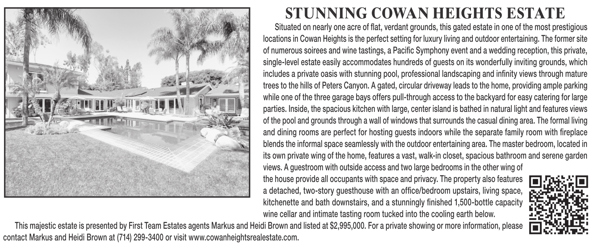 This majestic estate is presented by First Team Estates agents Markus and Heidi Brown and listed at $2,995,000. For a private showing or more information, please contact Markus and Heidi Brown at (714) 299-3400 or visit www.cowanheightsrealestate.com.