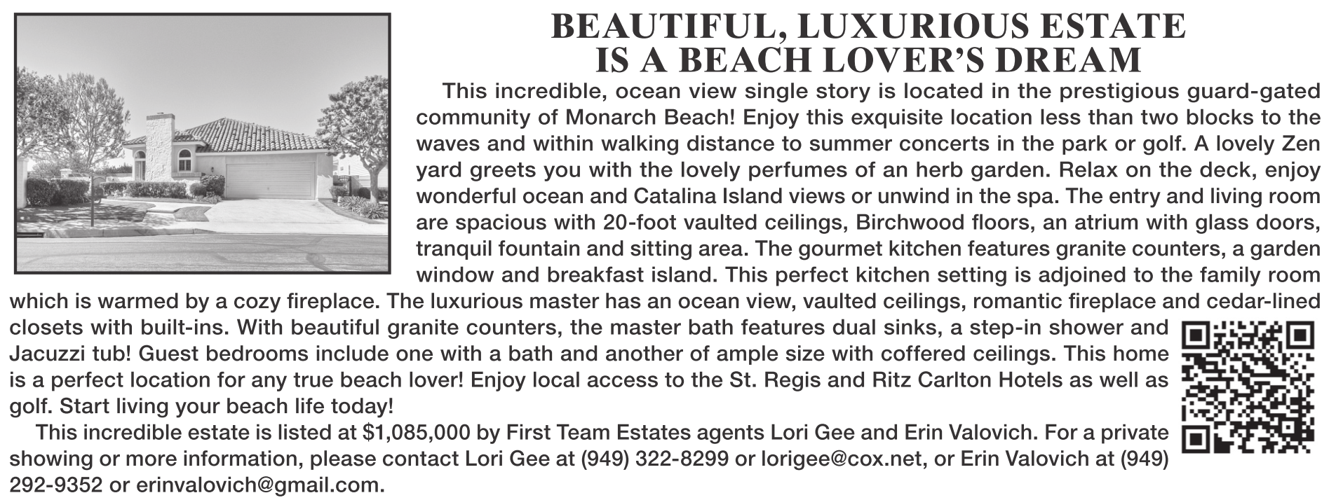 This incredible estate is listed at $1,085,000 by First Team Estates agents Lori Gee and Erin Valovich. For a private showing or more information, please contact Lori Gee at (949) 322-8299 or lorigee@cox.net, or Erin Valovich at (949) 292-9352 or erinvalovich@gmail.com.