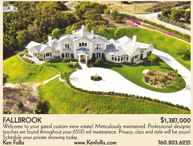 FALLBROOK $1,387,000 Welcome to your gated custom view estate! Meticulously maintained. Professional designer touches are found throughout your 6500 esf masterpiece. Privacy, class and style will be yours! Schedule your private showing today. Ken Follis www.Kenfollis.com 760.803.6235