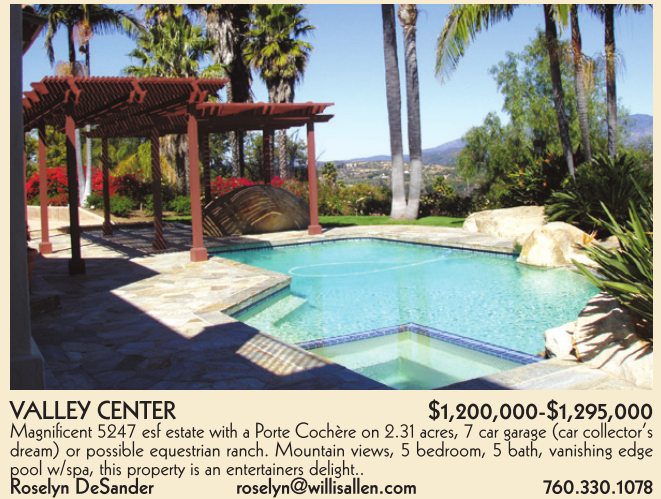 VALLEY CENTER $1,200,000-$1,295,000 Magnificent 5247 esf estate with a Porte Cochère on 2.31 acres, 7 car garage (car collector’s dream) or possible equestrian ranch. Mountain views, 5 bedroom, 5 bath, vanishing edge pool w/spa, this property is an entertainers delight.. Roselyn DeSander roselyn@willisallen.com 760.330.1078
