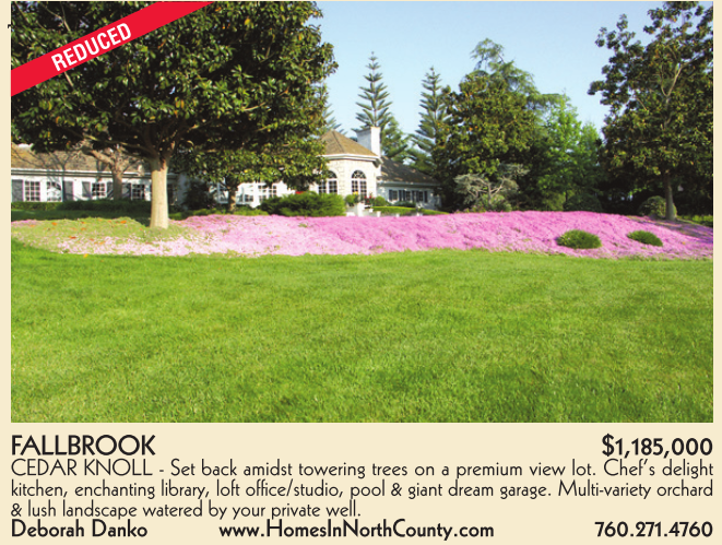 7. Kingridge FALLBROOK $1,185,000 CEDAR KNOLL - Set back amidst towering trees on a premium view lot. Chef’s delight kitchen, enchanting library, loft office/studio, pool & giant dream garage. Multi-variety orchard & lush landscape watered by your private well. Deborah Danko www.HomesInNorthCounty.com 760.271.4760