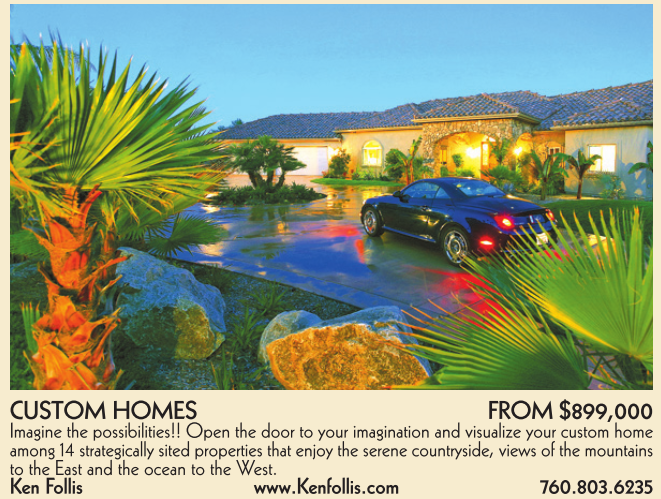 4 CUSTOM HOMES FROM $899,000 Imagine the possibilities!! Open the door to your imagination and visualize your custom home among 14 strategically sited properties that enjoy the serene countryside, views of the mountains to the East and the ocean to the West. Ken Follis www.Kenfollis.com 760.803.6235