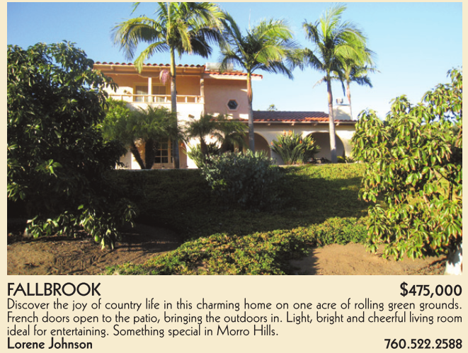 FALLBROOK $475,000 Discover the joy of country life in this charming home on one acre of rolling green grounds. French doors open to the patio, bringing the outdoors in. Light, bright and cheerful living room ideal for entertaining. Something special in Morro Hills. Lorene Johnson 760.522.2588