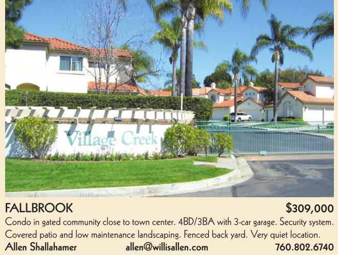 FALLBROOK $309,000 Condo in gated community close to town center. 4BD/3BA with 3-car garage. Security system.
