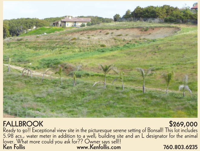 FALLBROOK $269,000 Ready to go!! Exceptional view site in the picturesque serene setting of Bonsall! This lot includes 5.98 acs., water meter in addition to a well, building site and an L designator for the animal lover. What more could you ask for?? Owner says sell!! Ken Follis www.Kenfollis.com 760.803.6235