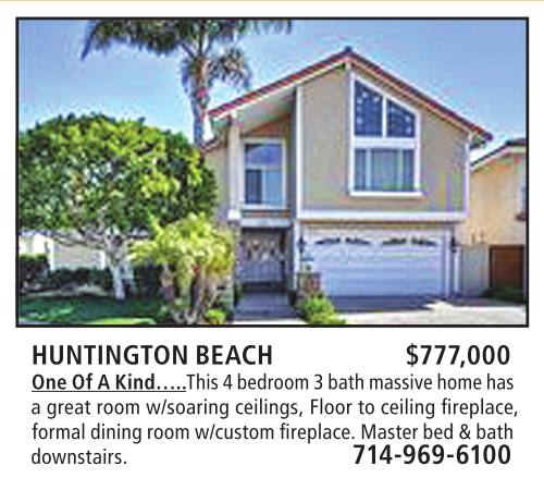 HUNTINGTON BEACH $777,000 One Of A Kind…..This 4 bedroom 3 bath massive home has a great room w/soaring ceilings, Floor to ceiling fireplace, formal dining room w/custom fireplace. Master bed & bath downstairs. 714-969-6100