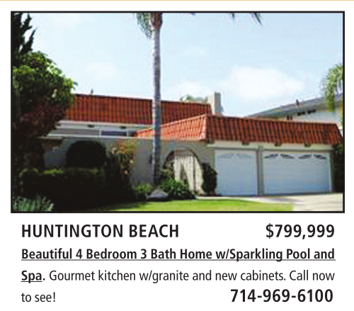 HUNTINGTON BEACH $799,999 Beautiful 4 Bedroom 3 Bath Home w/Sparkling Pool and Spa. Gourmet kitchen w/granite and new cabinets. Call now to see! 714-969-6100