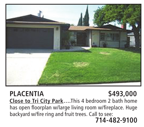 PLACENTIA $493,000 Close to Tri City Park….This 4 bedroom 2 bath home has open fl oorplan w/large living room w/fi replace. Huge backyard w/fire ring and fruit trees. Call to see: