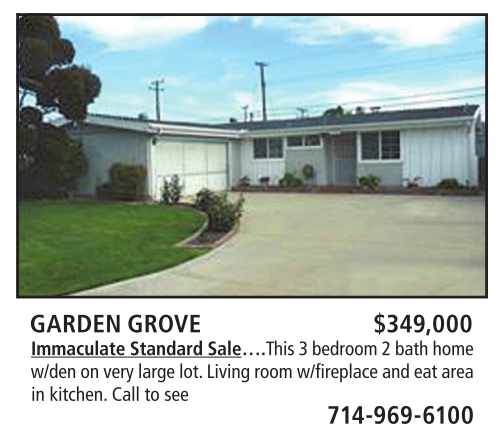 GARDEN GROVE $349,000 Immaculate Standard Sale….This 3 bedroom 2 bath home w/den on very large lot. Living room w/fireplace and eat area in kitchen. Call to see 714-969-6100