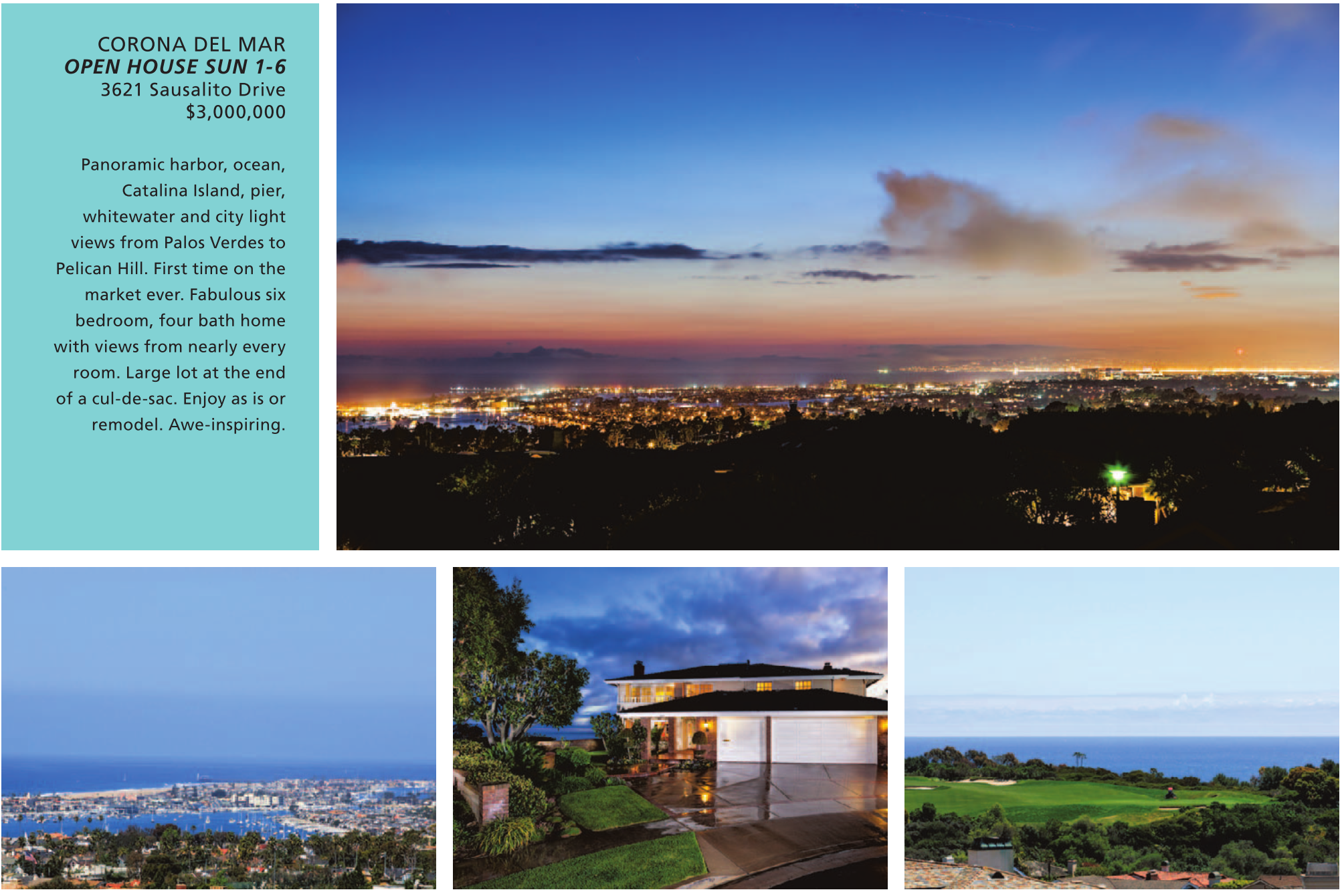 CORONA DEL MAR OPEN HOUSE SUN 1-6 3621 Sausalito Drive $3,000,000 Panoramic harbor, ocean, Catalina Island, pier, whitewater and city light views from Palos Verdes to Pelican Hill. First time on the market ever. Fabulous six bedroom, four bath home with views from nearly every room. Large lot at the end of a cul-de-sac. Enjoy as is or remodel. Awe-inspiring.