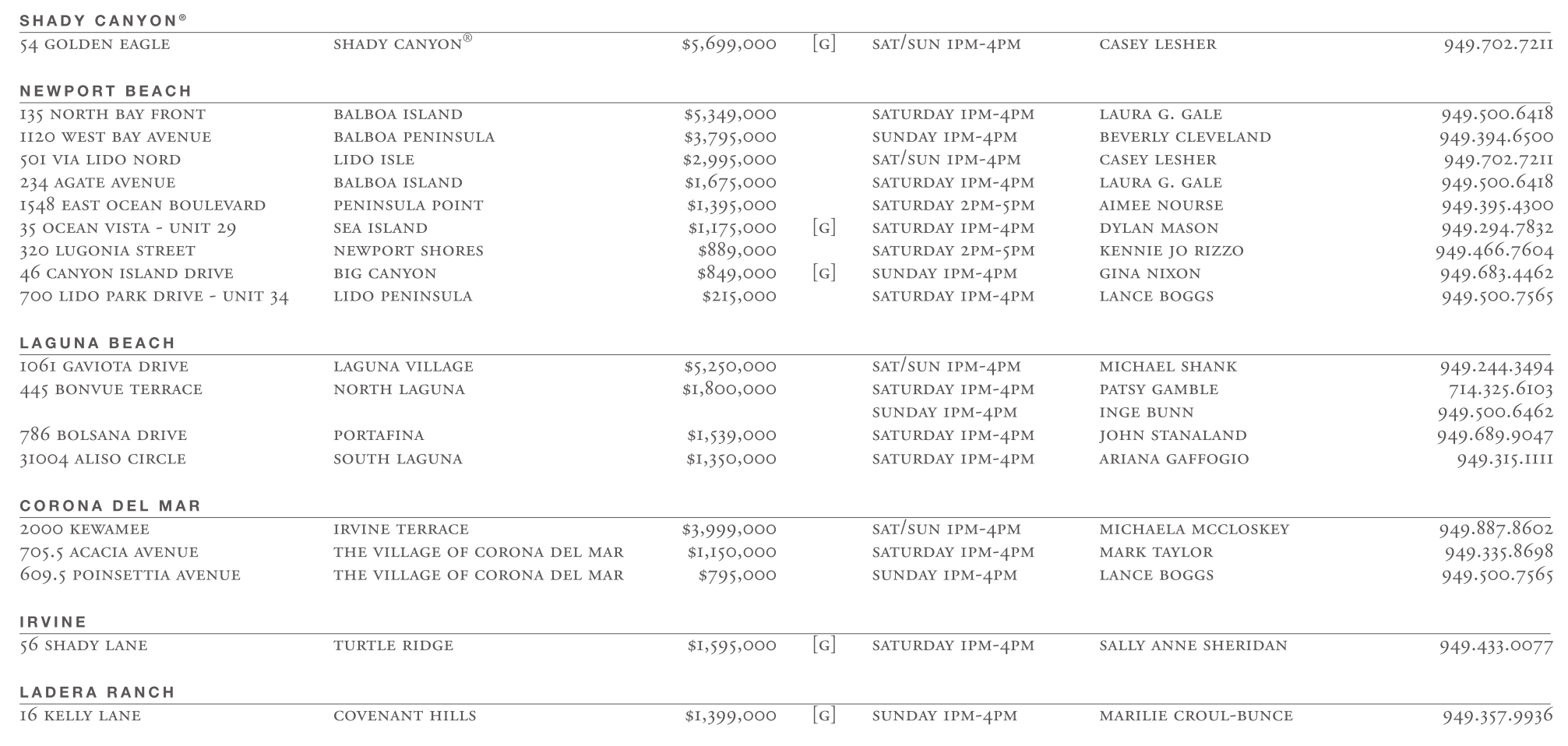 NEWPORT BEACH 135 north bay front balboa island $5,349,000 saturday 1pm-4pm laura g. gale 949.500.6418 1120 west bay avenue balboa peninsula $3,795,000 sunday 1pm-4pm beverly cleveland 949.394.6500 501 via lido nord lido isle $2,995,000 sat/sun 1pm-4pm casey lesher 949.702.7211 234 agate avenue balboa island $1,675,000 saturday 1pm-4pm laura g. gale 949.500.6418 1548 east ocean boulevard peninsula point $1,395,000 saturday 2pm-5pm aimee nourse 949.395.4300 35 ocean vista - unit 29 sea island $1,175,000 [g] saturday 1pm-4pm dylan mason 949.294.7832 320 lugonia street newport shores $889,000 saturday 2pm-5pm kennie jo rizzo 949.466.7604 46 canyon island drive big canyon $849,000 [g] sunday 1pm-4pm gina nixon 949.683.4462 700 lido park drive - unit 34 lido peninsula $215,000 saturday 1pm-4pm lance boggs 949.500.7565