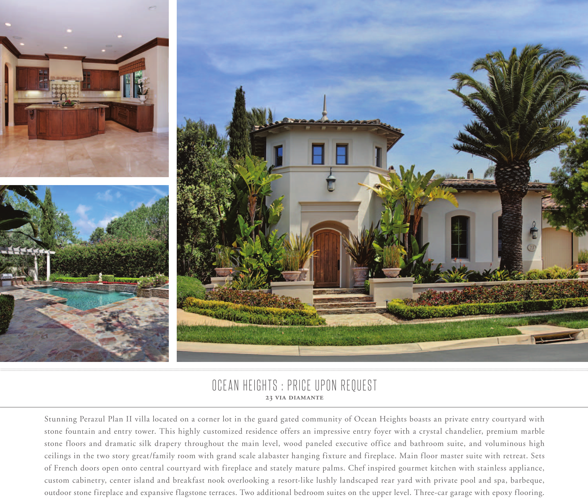 OCEAN HEIGHTS : PRICE UPON REQUEST 23 via diamante Stunning Perazul Plan II villa located on a corner lot in the guard gated community of Ocean Heights boasts an private entry courtyard with stone fountain and entry tower. This highly customized residence offers an impressive entry foyer with a crystal chandelier, premium marble stone floors and dramatic silk drapery throughout the main level, wood paneled executive office and bathroom suite, and voluminous high ceilings in the two story great/family room with grand scale alabaster hanging fixture and fireplace. Main floor master suite with retreat. Sets of French doors open onto central courtyard with fireplace and stately mature palms. Chef inspired gourmet kitchen with stainless appliance, custom cabinetry, center island and breakfast nook overlooking a resort-like lushly landscaped rear yard with private pool and spa, barbeque, outdoor stone fireplace and expansive flagstone terraces. Two additional bedroom suites on the upper level. Three-car garage with epoxy flooring.