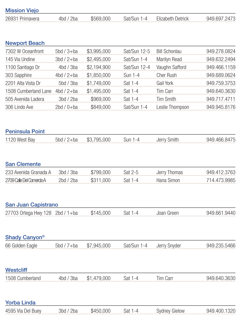 Newport Beach 7302 W Oceanfront 5bd / 3+ba $3,995,000 Sat/Sun 12-5 Bill Schonlau 949.278.0824 145 Via Undine 3bd / 2+ba $2,495,000 Sat/Sun 1-4 Marilyn Read 949.632.2494 1100 Santiago Dr 4bd / 3ba $2,194,900 Sat/Sun 12-4 Vaughn Safford 949.466.1159 303 Sapphire 4bd / 2+ba $1,850,000 Sun 1-4 Cher Rush 949.689.0624 2201 Alta Vista Dr 5bd / 3ba $1,749,000 Sat 1-4 Gail York 949.759.3753 1508 Cumberland Lane 4bd / 2+ba $1,495,000 Sat 1-4 Tim Carr 949.640.3630 505 Avenida Ladera 3bd / 2ba $969,000 Sat 1-4 Tim Smith 949.717.4711 306 Lindo Ave 2bd / 0+ba $849,000 Sat/Sun 1-4 Leslie Thompson 949.945.8176