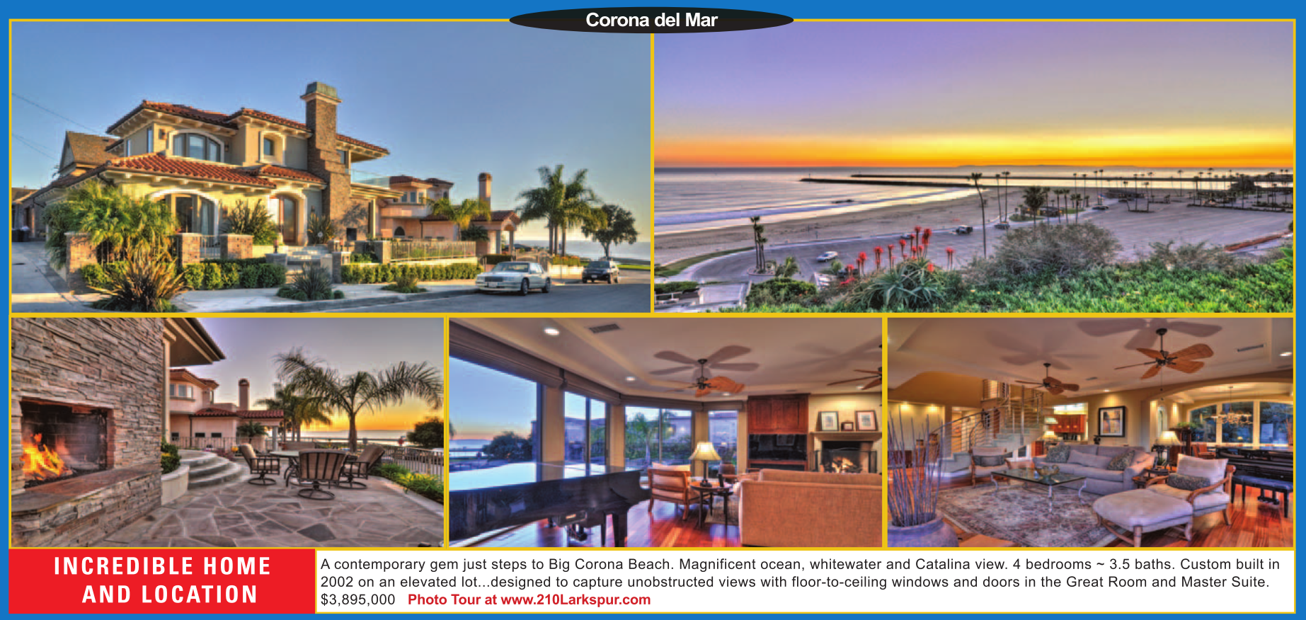 A contemporary gem just steps to Big Corona Beach. Magnificent ocean, whitewater and Catalina view. 4 bedrooms ~ 3.5 baths. Custom built in 2002 on an elevated lot...designed to capture unobstructed views with floor-to-ceiling windows and doors in the Great Room and Master Suite. $3,895,000 Photo Tour at www.210Larkspur.com