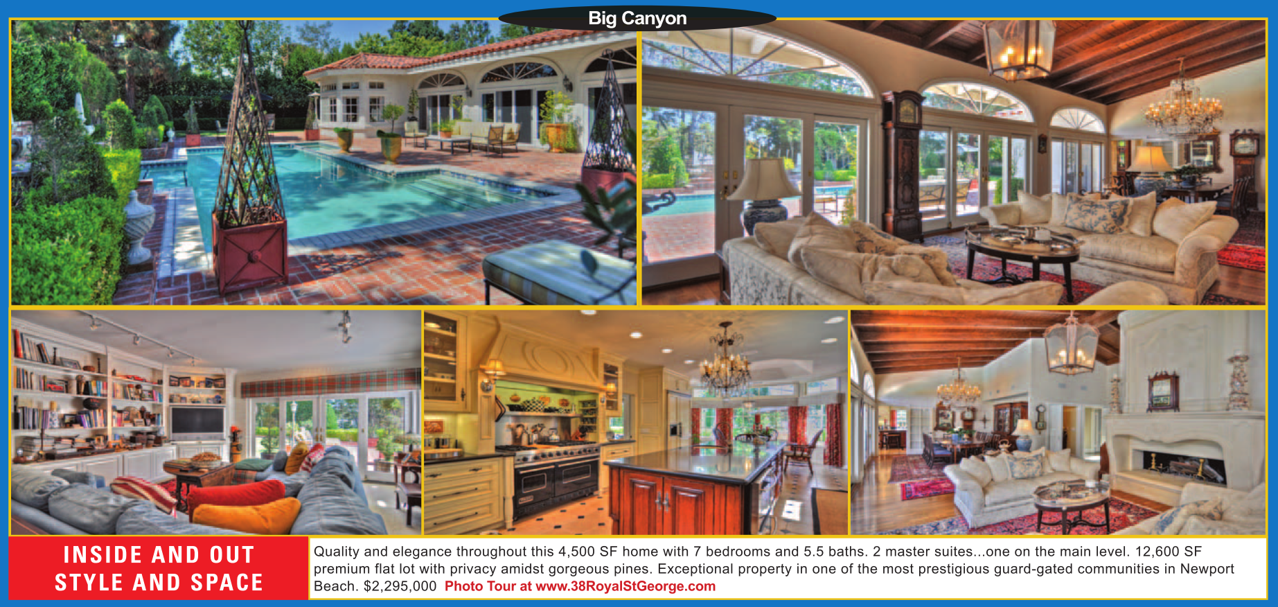 Quality and elegance throughout this 4,500 SF home with 7 bedrooms and 5.5 baths. 2 master suites...one on the main level. 12,600 SF premium flat lot with privacy amidst gorgeous pines. Exceptional property in one of the most prestigious guard-gated communities in Newport Beach. $2,295,000 Photo Tour at www.38RoyalStGeorge.com