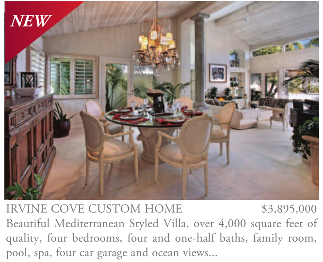 IRVINE COVE CUSTOM HOME $3,895,000 Beautiful Mediterranean Styled Villa, over 4,000 square feet of quality, four bedrooms, four and one-half baths, family room, pool, spa, four car garage and ocean views...