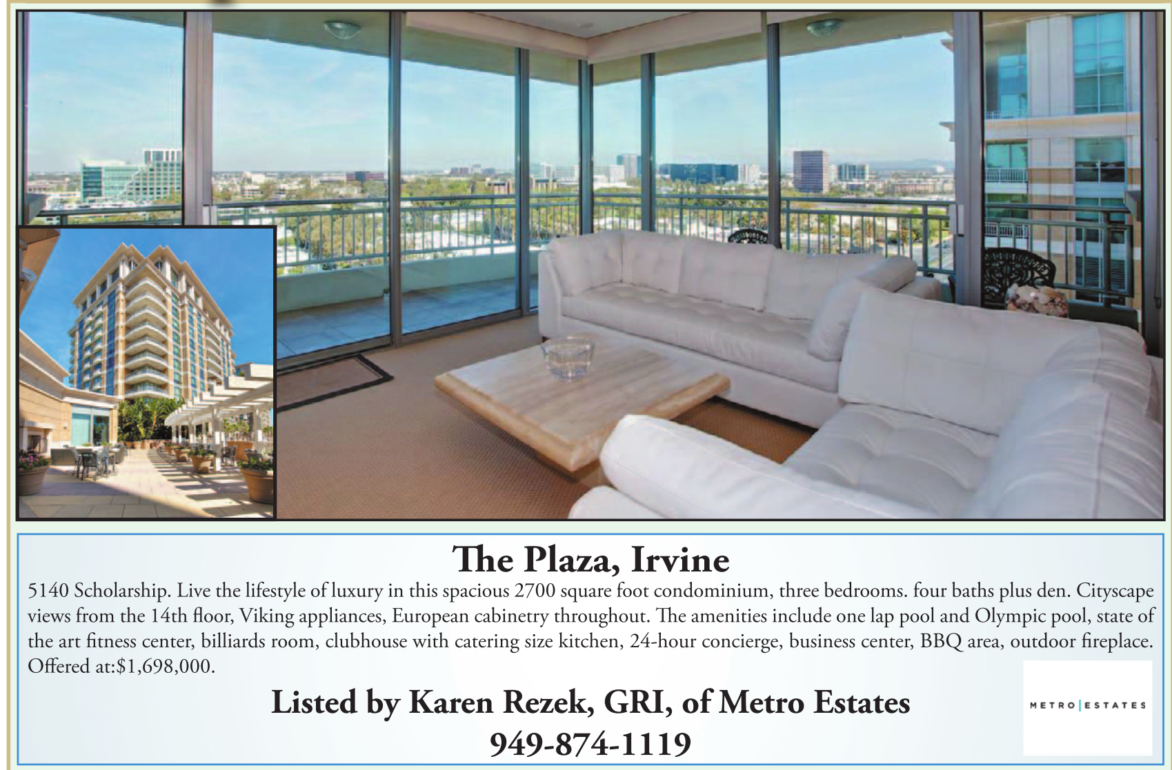The Plaza, Irvine 5140 Scholarship. Live the lifestyle of luxury in this spacious 2700 square foot condominium, three bedrooms. four baths plus den. Cityscape views from the 14th floor, Viking appliances, European cabinetry throughout. The amenities include one lap pool and Olympic pool, state of the art fitness center, billiards room, clubhouse with catering size kitchen, 24-hour concierge, business center, BBQ area, outdoor fireplace. Offered at:$1,698,000. Listed by Karen Rezek, GRI, of Metro Estates 949-874-1119