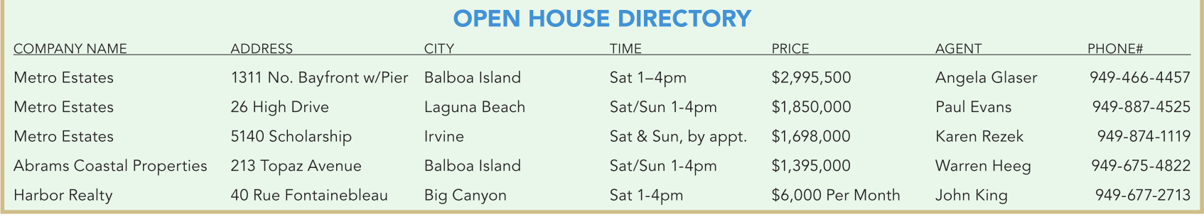 OPEN HOUSE DIRECTORY COMPANY NAME ADDRESS CITY TIME PRICE AGENT PHONE# Metro Estates 1311 No. Bayfront w/Pier Balboa Island Sat 1–4pm $2,995,500 Angela Glaser 949-466-4457 Metro Estates 26 High Drive Laguna Beach Sat/Sun 1-4pm $1,850,000 Paul Evans 949-887-4525 Metro Estates 5140 Scholarship Irvine Sat & Sun, by appt. $1,698,000 Karen Rezek 949-874-1119 Abrams Coastal Properties 213 Topaz Avenue Balboa Island Sat/Sun 1-4pm $1,395,000 Warren Heeg 949-675-4822 Harbor Realty 40 Rue Fontainebleau Big Canyon Sat 1-4pm $6,000 Per Month John King 949-677-2713