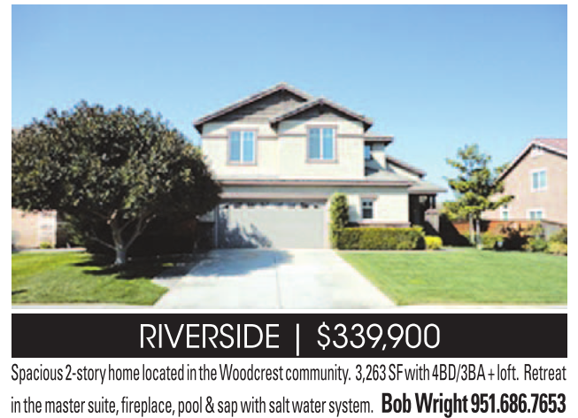 Spacious 2-story home located in the Woodcrest community. 3,263 SF with 4BD/3BA + loft. Retreat in the master suite, fireplace, pool & sap with salt water system. Bob Wright 951.686.7653
