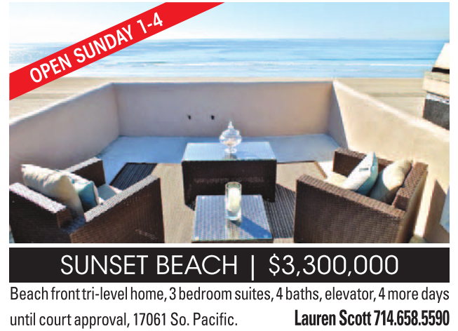 Beach front tri-level home, 3 bedroom suites, 4 baths, elevator, 4 more days until court approval, 17061 So. Pacific. Lauren Scott 714.658.5590