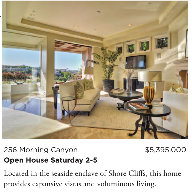 256 Morning Canyon $5,395,000 Open House Saturday 2-5 Located in the seaside enclave of Shore Cliffs, this home provides expansive vistas and voluminous living.