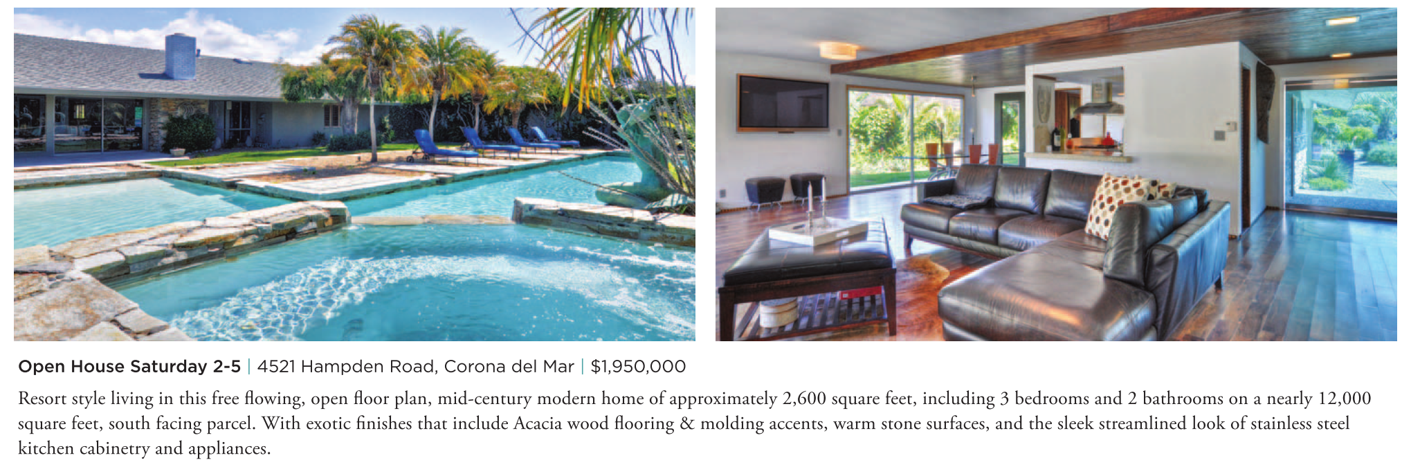 Open House Saturday 2-5 | 4521 Hampden Road, Corona del Mar | $1,950,000 Resort style living in this free flowing, open floor plan, mid-century modern home of approximately 2,600 square feet, including 3 bedrooms and 2 bathrooms on a nearly 12,000 square feet, south facing parcel. With exotic finishes that include Acacia wood flooring & molding accents, warm stone surfaces, and the sleek streamlined look of stainless steel kitchen cabinetry and appliances.