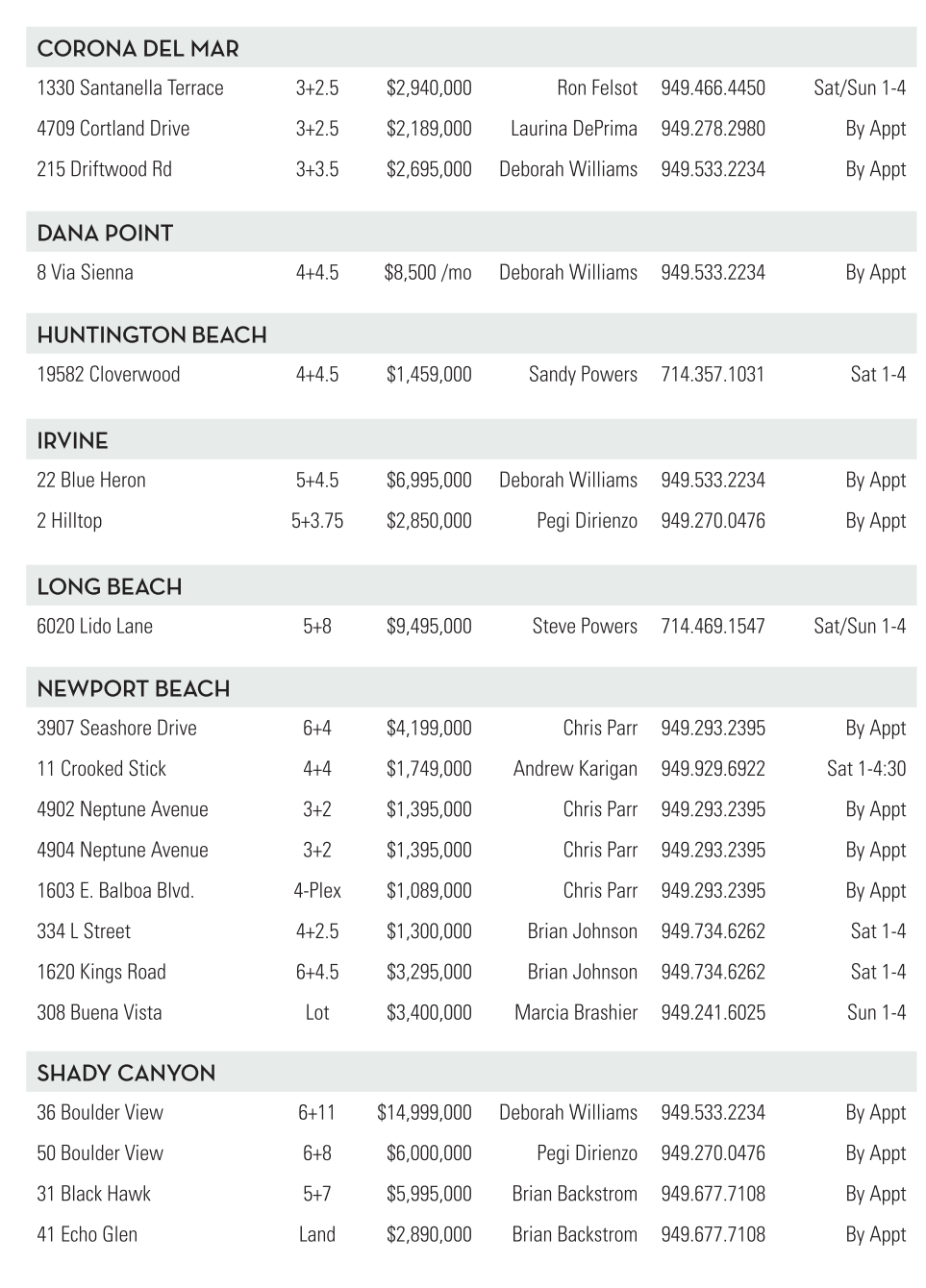 CORONA DEL MAR 1330 Santanella Terrace 3+2.5 $2,940,000 Ron Felsot 949.466.4450 Sat/Sun 1-4 4709 Cortland Drive 3+2.5 $2,189,000 Laurina DePrima 949.278.2980 By Appt 215 Driftwood Rd 3+3.5 $2,695,000 Deborah Williams 949.533.2234 By Appt