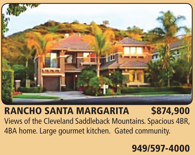 RANCHO SANTA MARGARITA $874,900 Views of the Cleveland Saddleback Mountains. Spacious 4BR, 4BA home. Large gourmet kitchen. Gated community.