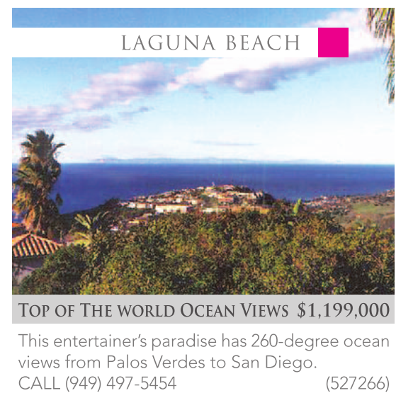 Top of The world Ocean Views $1,199,000 This entertainer’s paradise has 260-degree ocean views from Palos Verdes to San Diego. CALL (949) 497-5454 (527266)