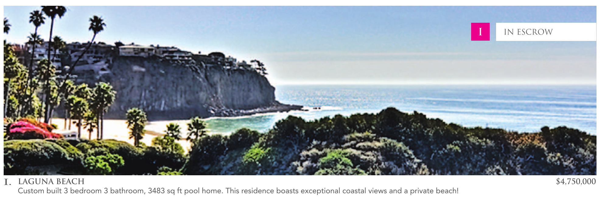 LAGUNA BEACH $4,750,000 Custom built 3 bedroom 3 bathroom, 3483 sq ft pool home. This residence boasts exceptional coastal views and a private beach!