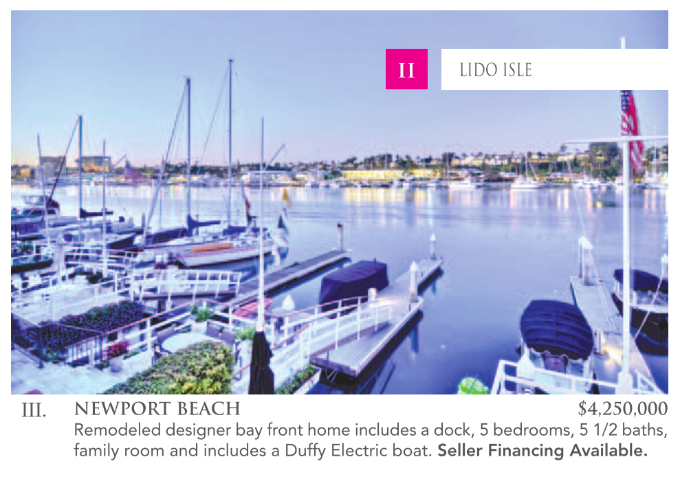 NEWPORT BEACH $4,250,000 Remodeled designer bay front home includes a dock, 5 bedrooms, 5 1/2 baths, family room and includes a Duffy Electric boat. Seller Financing Available.