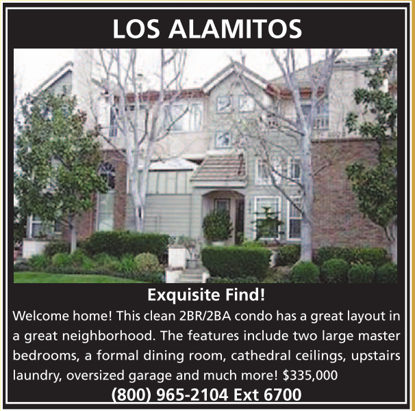 LOS ALAMITOS Exquisite Find! Welcome home! This clean 2BR/2BA condo has a great layout in a great neighborhood. The features include two large master bedrooms, a formal dining room, cathedral ceilings, upstairs laundry, oversized garage and much more! $335,000 (800) 965-2104 Ext 6700