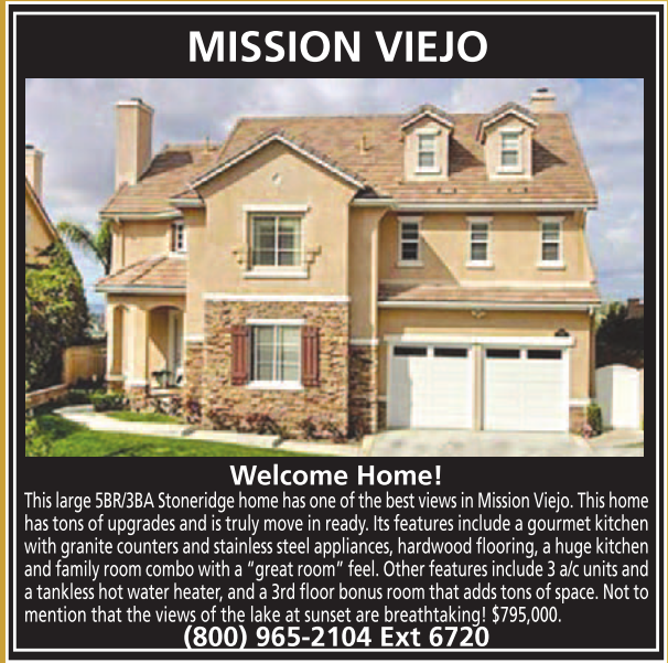 This large 5BR/3BA Stoneridge home has one of the best views in Mission Viejo. This home has tons of upgrades and is truly move in ready. Its features include a gourmet kitchen with granite counters and stainless steel appliances, hardwood flooring, a huge kitchen and family room combo with a “great room” feel. Other features include 3 a/c units and a tankless hot water heater, and a 3rd floor bonus room that adds tons of space. Not to mention that the views of the lake at sunset are breathtaking! $795,000.