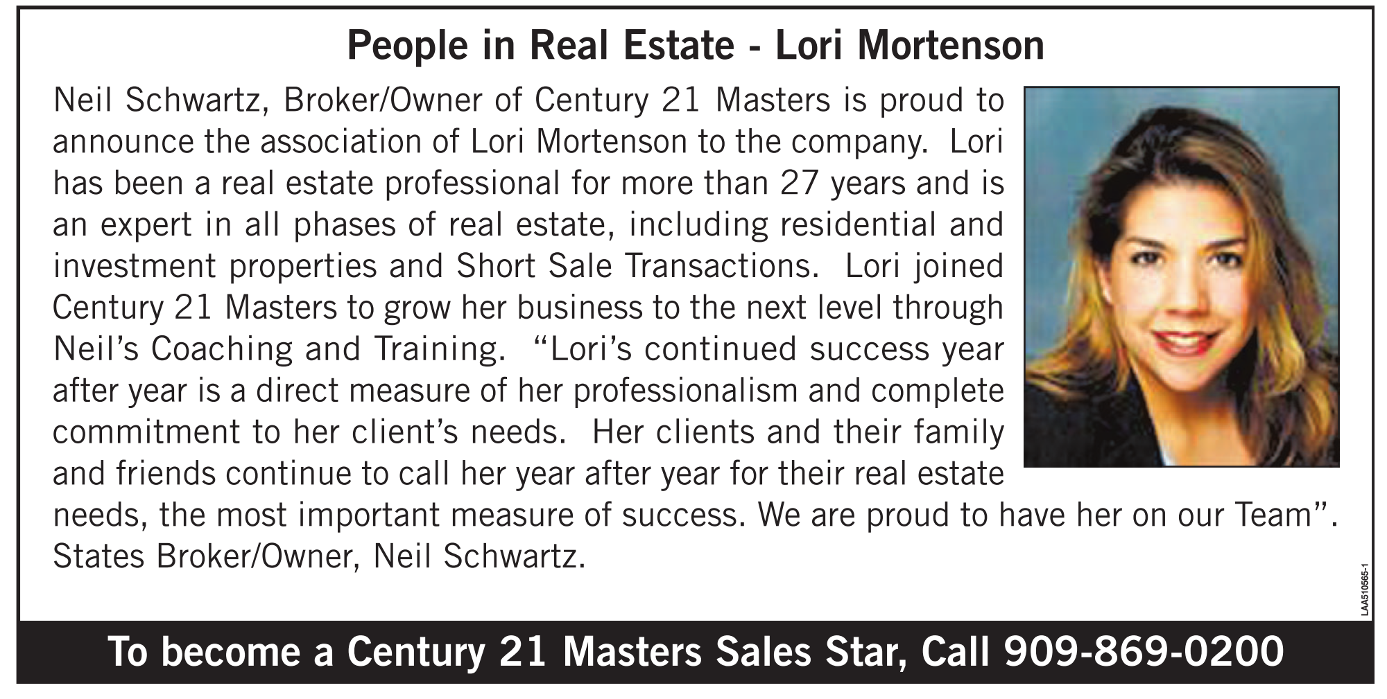 People in Real Estate - Lori Mortenson Neil Schwartz, Broker/Owner of Century 21 Masters is proud to announce the association of Lori Mortenson to the company. Lori has been a real estate professional for more than 27 years and is an expert in all phases of real estate, including residential and investment properties and Short Sale Transactions. Lori joined Century 21 Masters to grow her business to the next level through Neil’s Coaching and Training. “Lori’s continued success year after year is a direct measure of her professionalism and complete commitment to her client’s needs. Her clients and their family and friends continue to call her year after year for their real estate needs, the most important measure of success. We are proud to have her on our Team”. States Broker/Owner, Neil Schwartz. To become a Century 21 Masters Sales Star, Call 909-869-0200