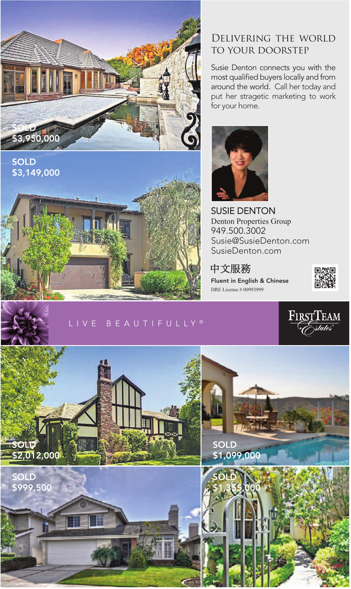 SOLD $3,950,000 SOLD $3,149,000 Delivering the world to your doorstep Susie Denton connects you with the most qualified buyers locally and from around the world. Call her today and put her stragetic marketing to work for your home. SUSIE DENTON Denton Properties Group 949.500.3002 Susie@SusieDenton.com SusieDenton.com Fluent in English & Chinese DRE License # 00993999 L I V E B E A U T I F U L L Y ® SOLD $2,012,000 SOLD $999,500 SOLD $1,099,000 SOLD $1,355,000