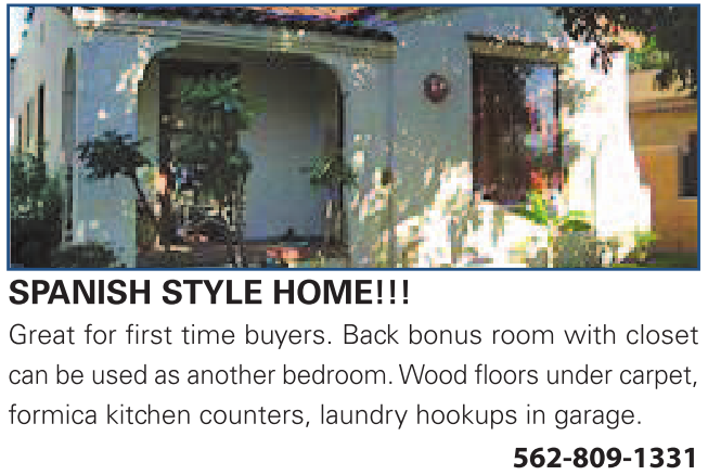 SPANISH STYLE HOME!!! Great for first time buyers. Back bonus room with closet can be used as another bedroom. Wood floors under carpet, formica kitchen counters, laundry hookups in garage.