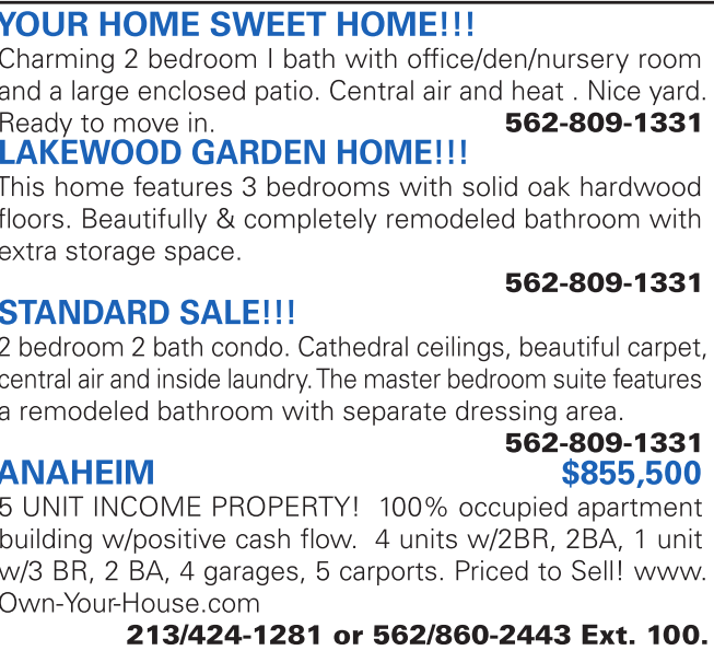 YOUR HOME SWEET HOME!!! Charming 2 bedroom I bath with office/den/nursery room and a large enclosed patio. Central air and heat . Nice yard. Ready to move in. 562-809-1331 LAKEWOOD GARDEN HOME!!! This home features 3 bedrooms with solid oak hardwood floors. Beautifully & completely remodeled bathroom with extra storage space. 562-809-1331 STANDARD SALE!!! 2 bedroom 2 bath condo. Cathedral ceilings, beautiful carpet, central air and inside laundry. The master bedroom suite features a remodeled bathroom with separate dressing area. 562-809-1331 ANAHEIM $855,500 5 UNIT INCOME PROPERTY! 100% occupied apartment building w/positive cash flow. 4 units w/2BR, 2BA, 1 unit w/3 BR, 2 BA, 4 garages, 5 carports. Priced to Sell! www. Own-Your-House.com 213/424-1281 or 562/860-2443 Ext. 100.