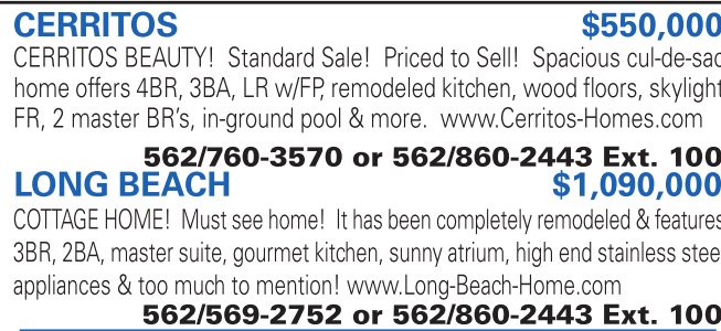 100. CERRITOS $550,000 CERRITOS BEAUTY! Standard Sale! Priced to Sell! Spacious cul-de-sac home offers 4BR, 3BA, LR w/FP, remodeled kitchen, wood floors, skylight, FR, 2 master BR’s, in-ground pool & more. www.Cerritos-Homes.com 562/760-3570 or 562/860-2443 Ext. 100. LONG BEACH $1,090,000 COTTAGE HOME! Must see home! It has been completely remodeled & features 3BR, 2BA, master suite, gourmet kitchen, sunny atrium, high end stainless steel appliances & too much to mention! www.Long-Beach-Home.com 562/569-2752 or 562/860-2443 Ext. 100.