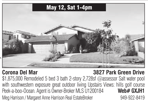 May 12, Sat 1-4pm Corona Del Mar 3827 Park Green Drive $1,875,000 Remodeled 5 bed 3 bath 2-story 2,728sf @assessor Salt water pool with southwestern exposure great outdoor living Upstairs Views: hills golf course Peek-a-boo-Ocean. Agent is Owner-Broker MLS U1200184 Web# GXJH1 Meg Harrison / Margaret Anne Harrison Real EstateBroker 949-922-8419