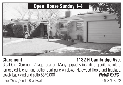 Open House Sunday 1-4 Claremont 1132 N Cambridge Ave. Great Old Claremont Village location. Many upgrades including granite counters, remodeled kitchen and baths, dual pane windows. Hardwood floors and fireplace. Lovely back yard and patio $579,000 Web# GXFC1 Carol Wiese/ Curtis Real Estate 909-376-8972