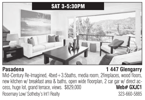 SAT 3-5:30PM Pasadena 1 447 Glengarry Mid-Century Re-Imagined, 4bed+3.5baths, media room, 2fireplaces, wood floors, new kitchen w/ breakfast area & baths, open wide floorplan, 2 car gar w/ direct access, huge lot, grand terrace, views. $829,000 Web# GXJC1 Rosemary Low/ Sotheby’s Int’l Realty 323-660-5885